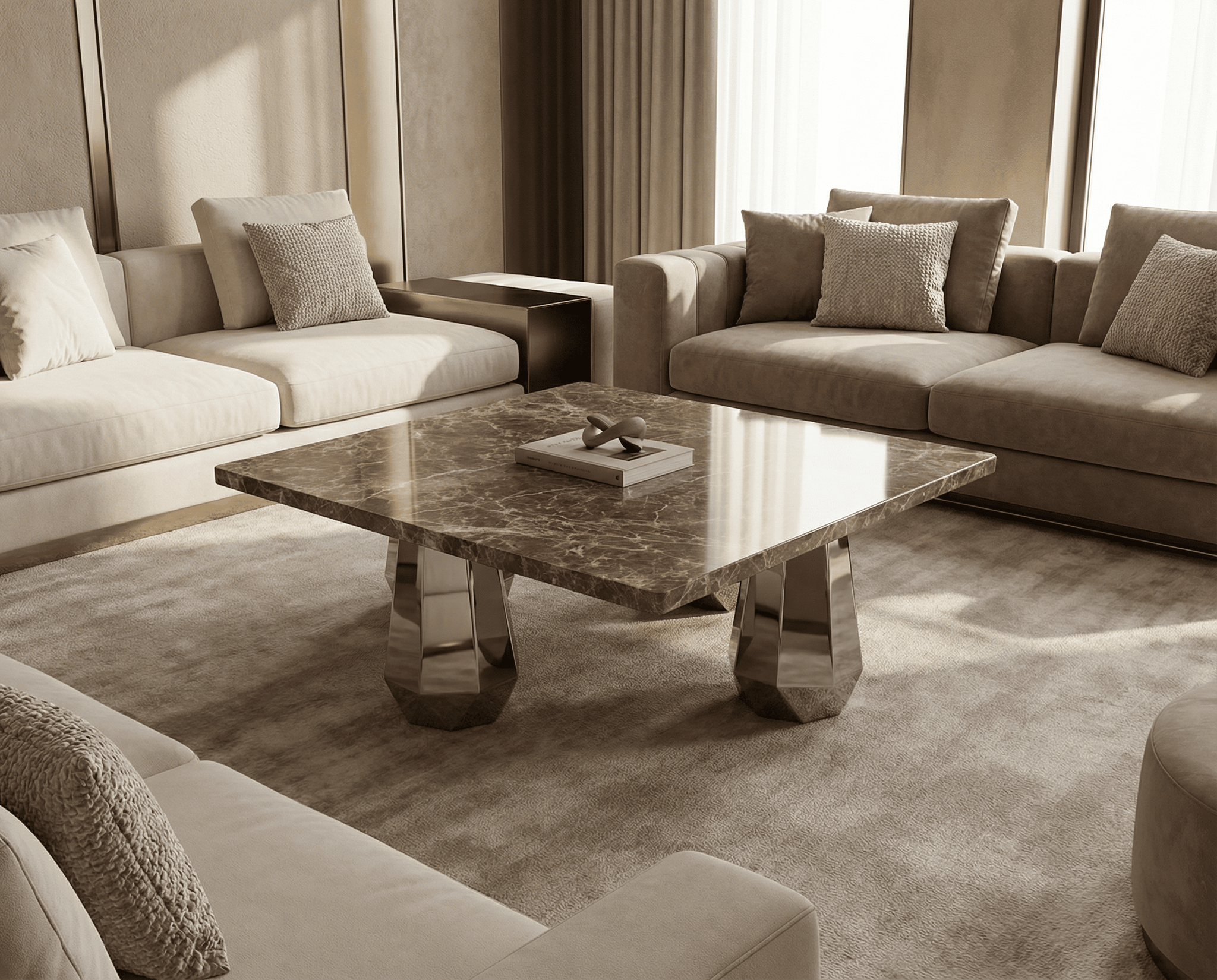 Silver Mist marble console tables showcase layered gray and beige tones that create calm, contemporary sophistication. Designed for modern luxury homes, these marble consoles appeal to buyers searching for refined stone furniture that feels balanced, serene, and understatedly elegant.